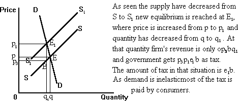After the imposition of tax the supply curve moves upwards by the amount of tax, because supplier gets then the amount which it did before and government gets the rest. This is shown below: